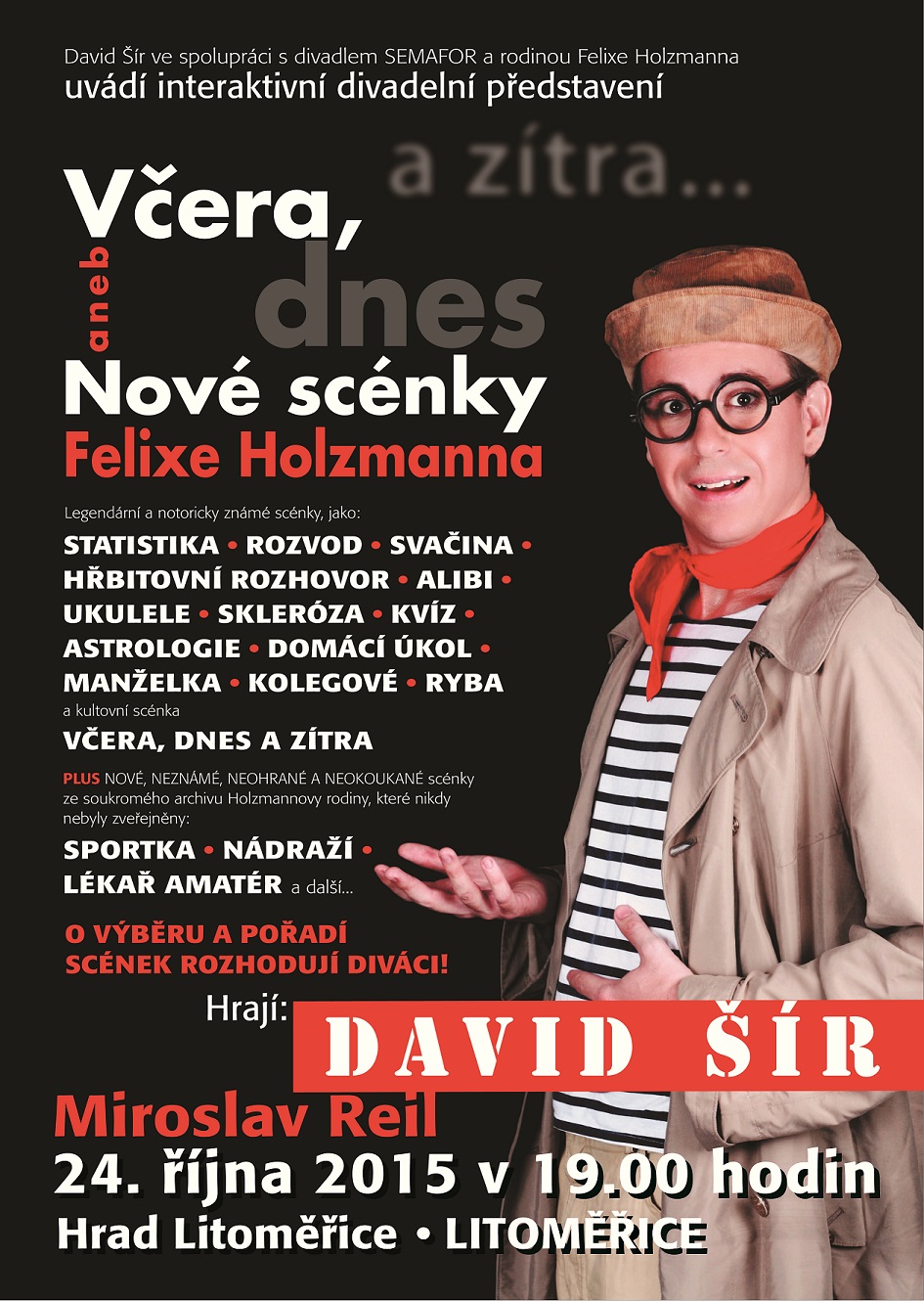 V rámci oslav 1210 let Ohře v Litoměřicích se Vám na litoměřickém hradě představí herci David Šír a Miroslav Reil v interaktivním divadelním představení s názvem Včera, dnes a zítra aneb Nové scénky Felixe Holzmanna. Těšit se můžete nejen na notoricky známé scénky jako Včera, dnes a zítra, Hřbitovní rozhovor, Ukulele, Kvíz, Rozvod, Statistika, aj., ale také na zcela nové, neznáme a neohrané scénky ze soukromého archivu Holzmannovy rodiny.