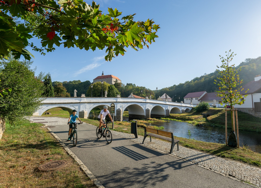 Váš výlet začíná u renesančního zámku Náměště nad Oslavou, který shlíží z výšiny na celé město. Pokud budete chtít, můžete hned na začátku navštívit některý z jeho tří prohlídkových okruhů. Přímo v Náměšti můžete obdivovat také „moravský Karlův most“, barokní klenot s 20 sochami vedoucí na náměstí. Poté vás čeká ještě pár desítek metrů přes centrum města a napojíte se na cyklotrasu (CT) 5106, která vás vyvede z města ven.