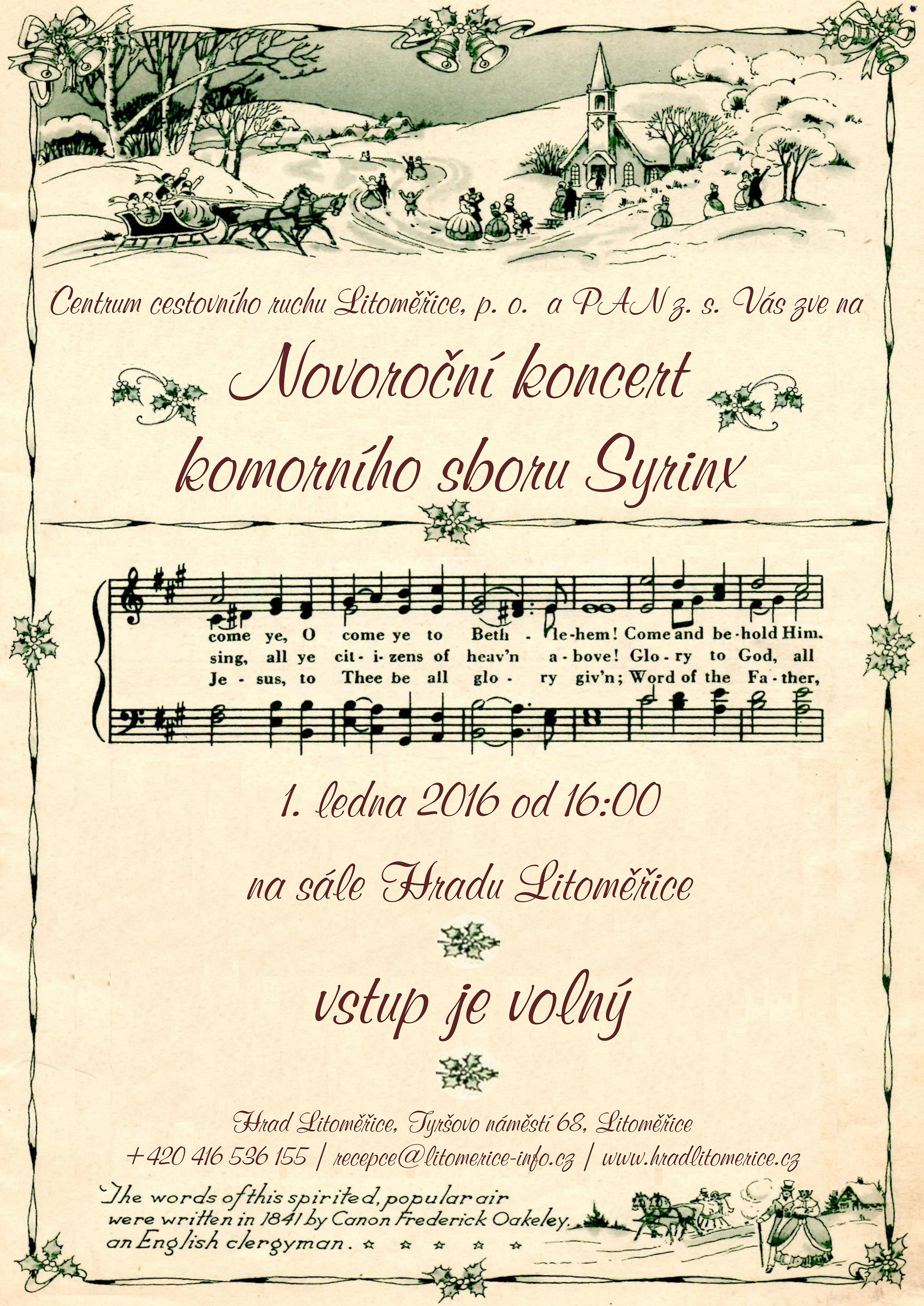 Hrad Litoměřice zahájí nový rok 2016 Novoročním koncertem. Tradiční, již třetí, novoroční vystoupení komorního sboru Syrinx opět vzniklo ve spolupráci Centra cestovního ruchu Litoměřice, p. o. a PAN z. s. Koncert bude tematicky rozdělen do dvou pomyslných bloků. V první části zazní díla starých mistrů a v druhé části úpravy populárních a jazzových písní.