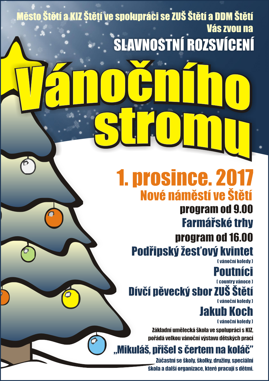 Dovolujeme si Vás pozvat 1. prosince 2017 na slavnostní rozsvícení Vánočního stromu na Novém náměstí ve Štětí. Jako již tradičně budou na náměstí od dopoledních hodin probíhat Farmářské trhy a rozsvícení stromku si zpříjemníme poslechem vánočních koled.