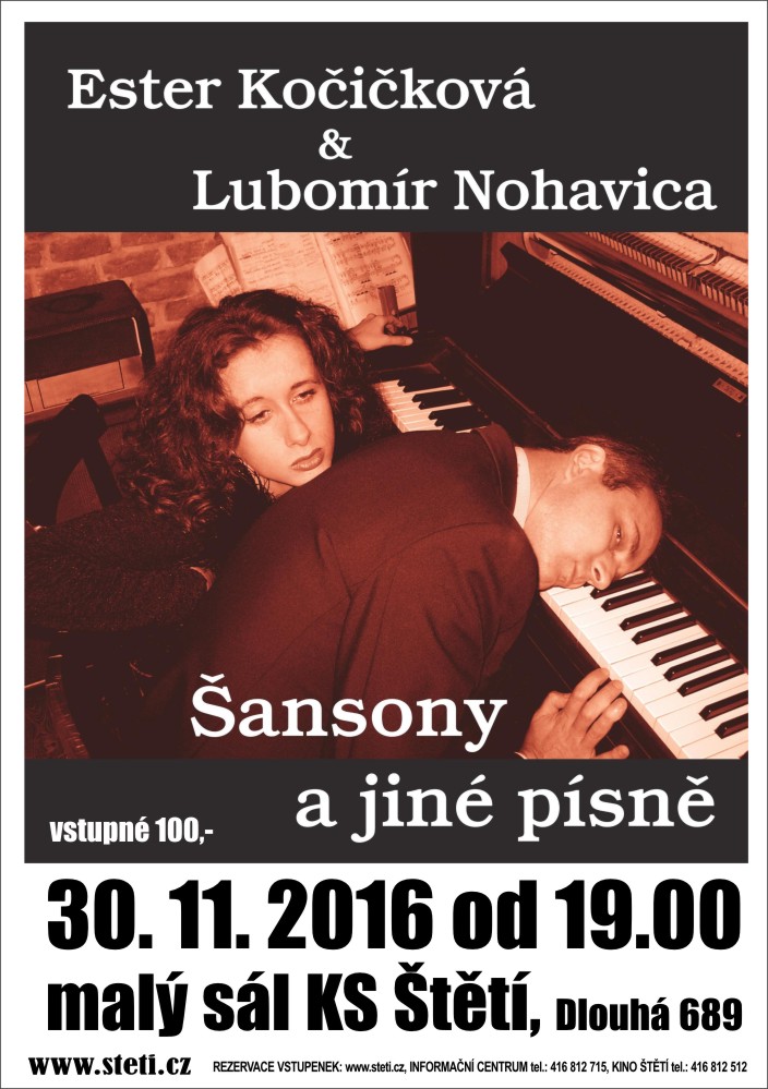 Dovolujeme si vás pozvat na zábavný večer ve společnosti Ester Kočičkové a Lubomíra Nohavici. Akce se uskuteční ve středu 30. listopadu, na Malém sále Kulturního střediska od 19:00 hod. Vstupné 100,- Kč Obec: Ústecký krajŠtětí Tweet